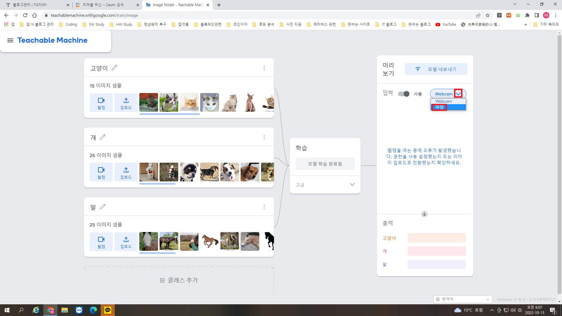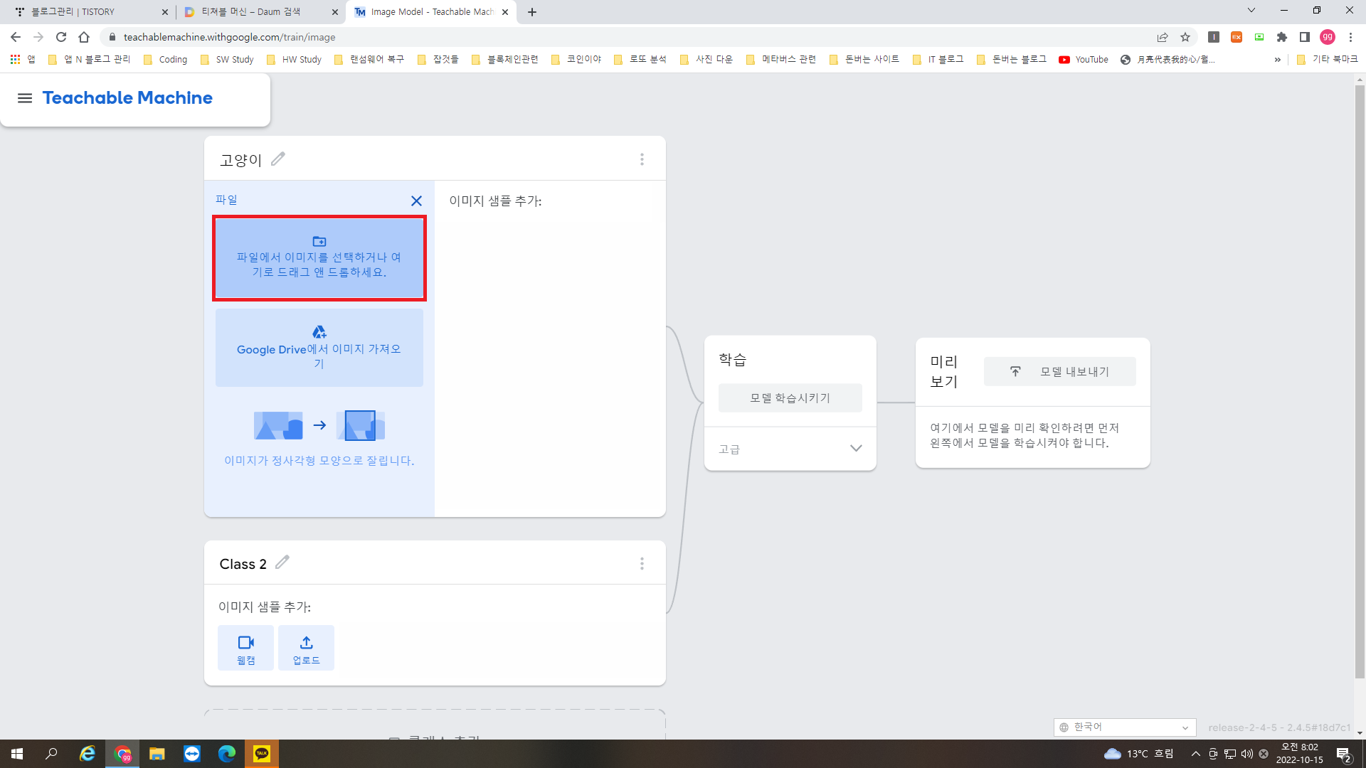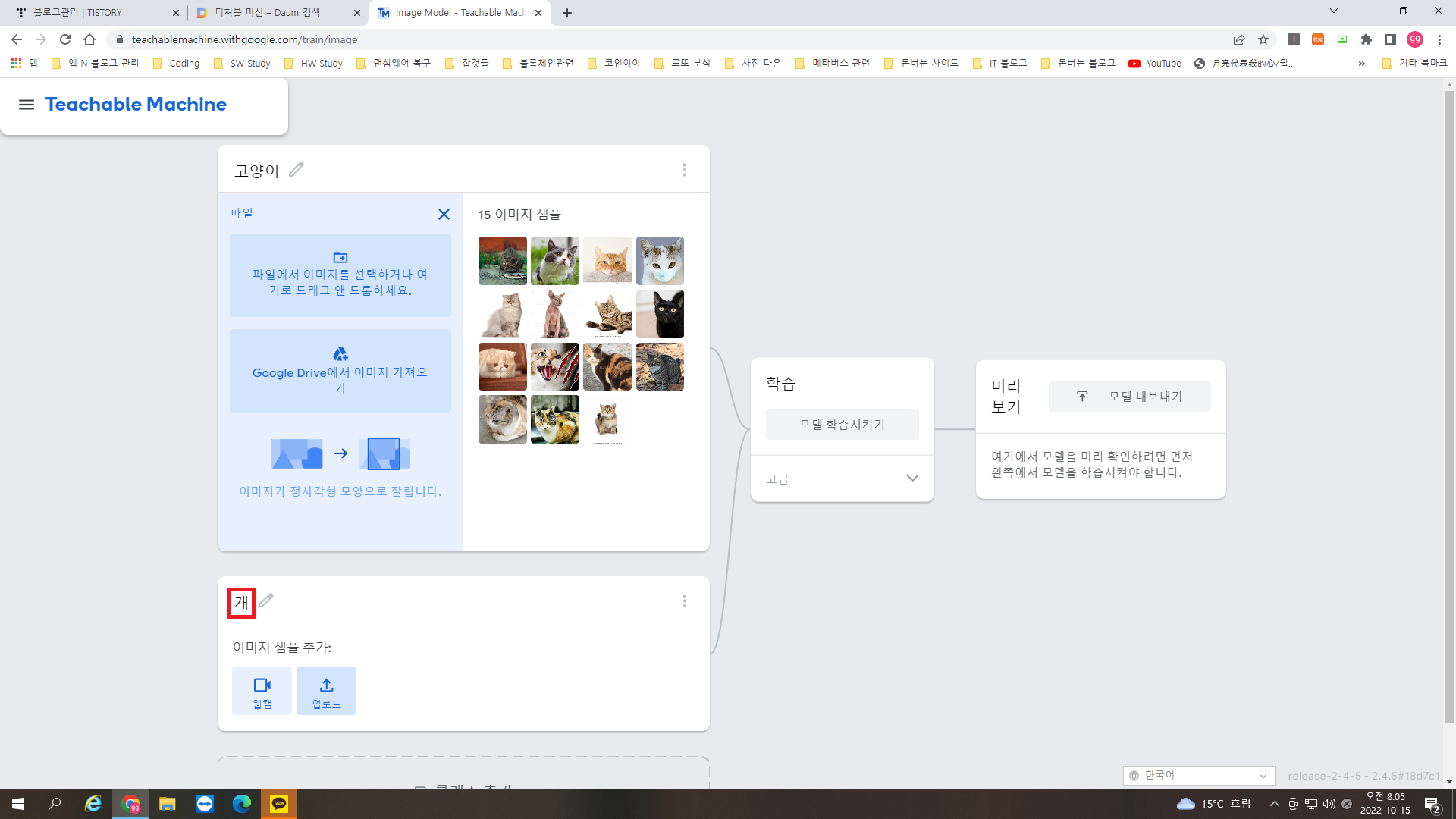 위에서 작업한 방법 그대로 한번 더 작업하고 우측의 학습, '모델 학습시키기' 버튼을 클릭한다.