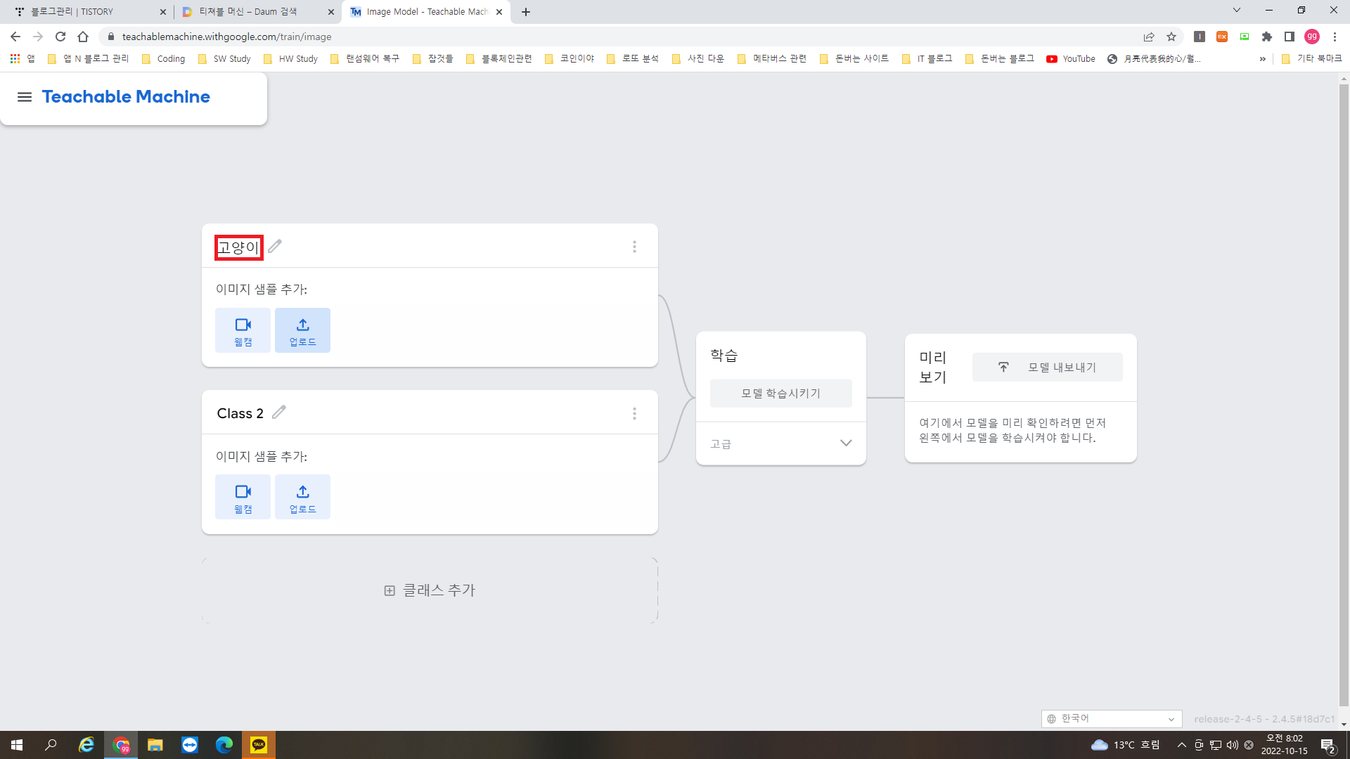 더 많은 종류의 이미지를 학습시키고 싶으면 하단부의 '+ 클래스 추가' 버튼을 클릭해 클래스를 추가한다.