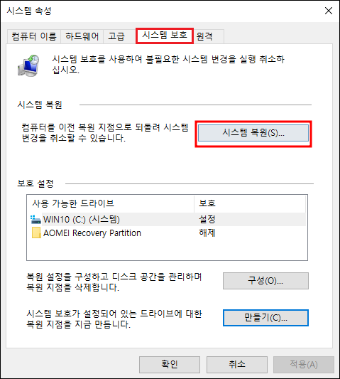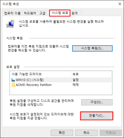 그러면 '시스템 속성' 창이 열린다. 여기서 '시스템 보호' 탭을 선택하고 하단에 있는 '만들기' 버튼을 클릭한다.