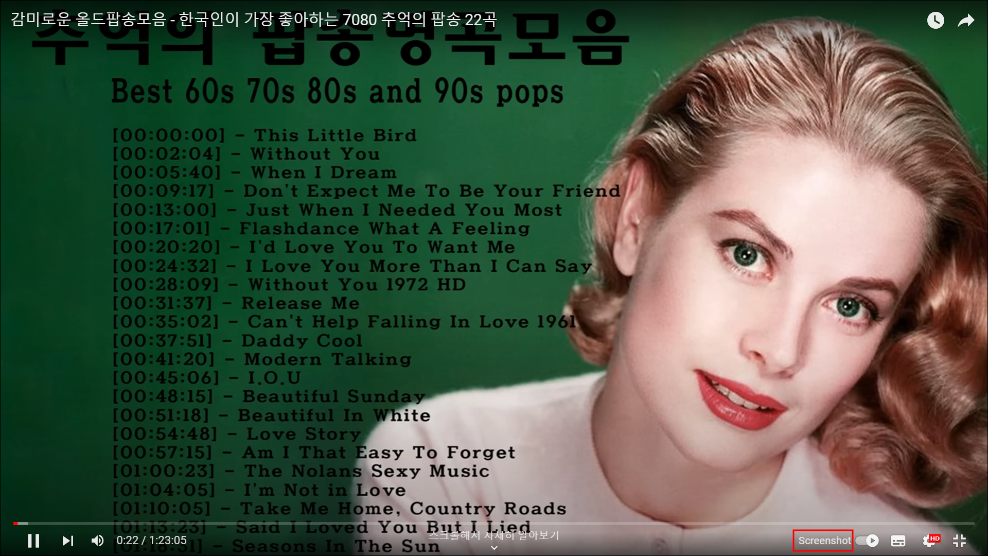 이제 유튜브를 켜고 화면을 보면 우하단에 'Screenshot'이라는 글자가 나타난다. 캡처하기 원하는 장면이 나오면 화면에 어떤 자막이나 타임라인이 있건 상관없이 이 'Screenshot' 글자를 클릭해 보자.