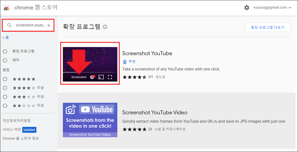 구글 검색창에서 '크롬 웹 스토어'를 찾아서 들어간다. 크롬 웹 스토어 창이 열리면 좌상단 검색창에 'screenshot youtube'라고 입력한다. 그러면 'Screenshot YouTube' 확장 프로그램이 검색된다. 이 확장 프로그램을 클릭한다.