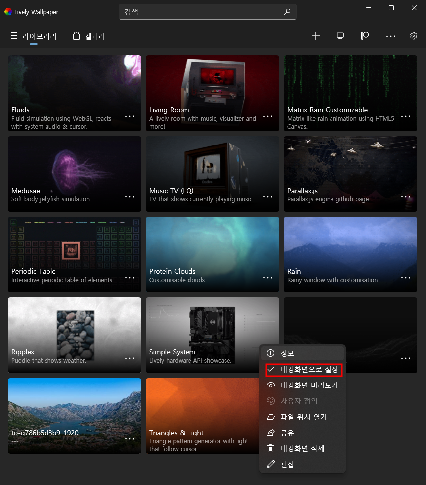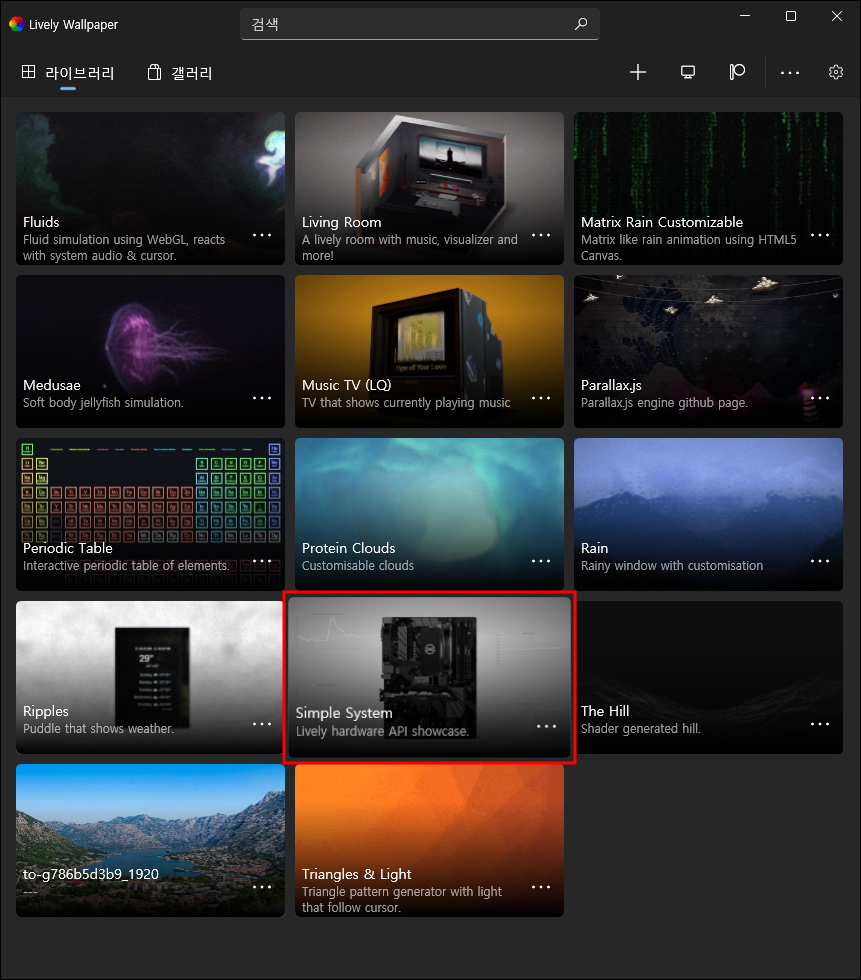 다운받은 Lively Wallpaper를 설치하면 아래와 같은 화면이 나타난다. 13 개의 기본 Lively Wallpaper가 포함되어 있는데 이 것들 중 하나를 클릭해서 설치하면 된다. 아래 13개의 Lively Wallpaper 이미지 중에서 필자가 제일 선호하는 배경 화면은 'Simple System'이다. 설치를 원하면 오른쪽 아래쪽에 있는 '3점' 아이콘을 클릭해 보자.