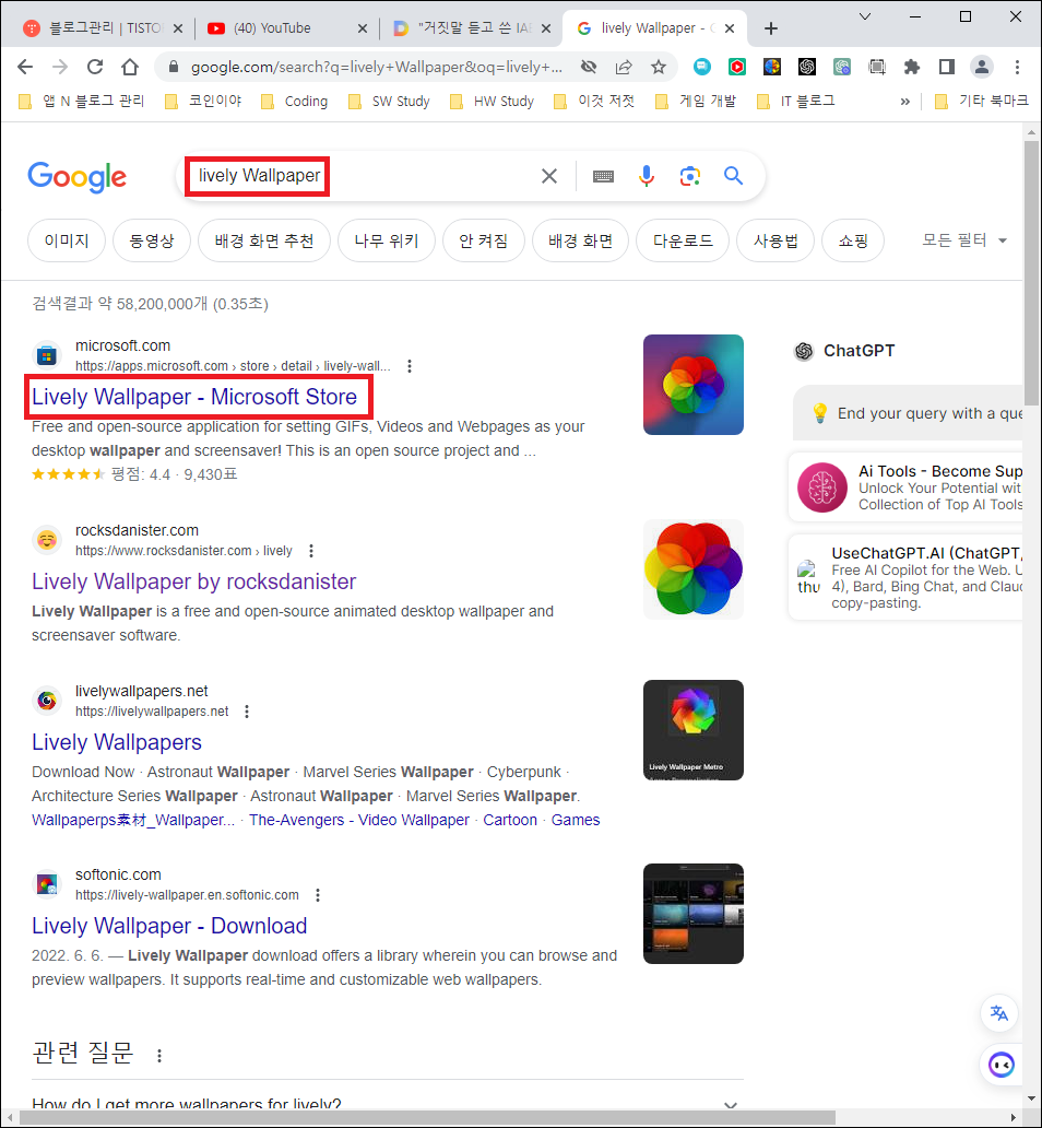 Lively Wallpaper가 나타나면 우상단의 '스토어 앱에서 다운로드'를 클릭한다.